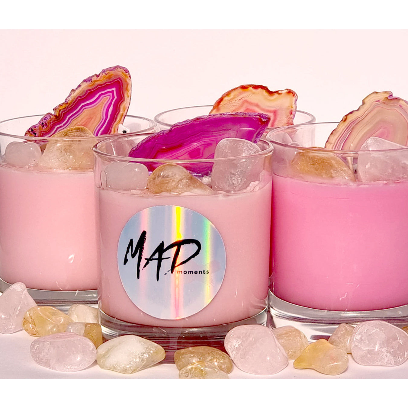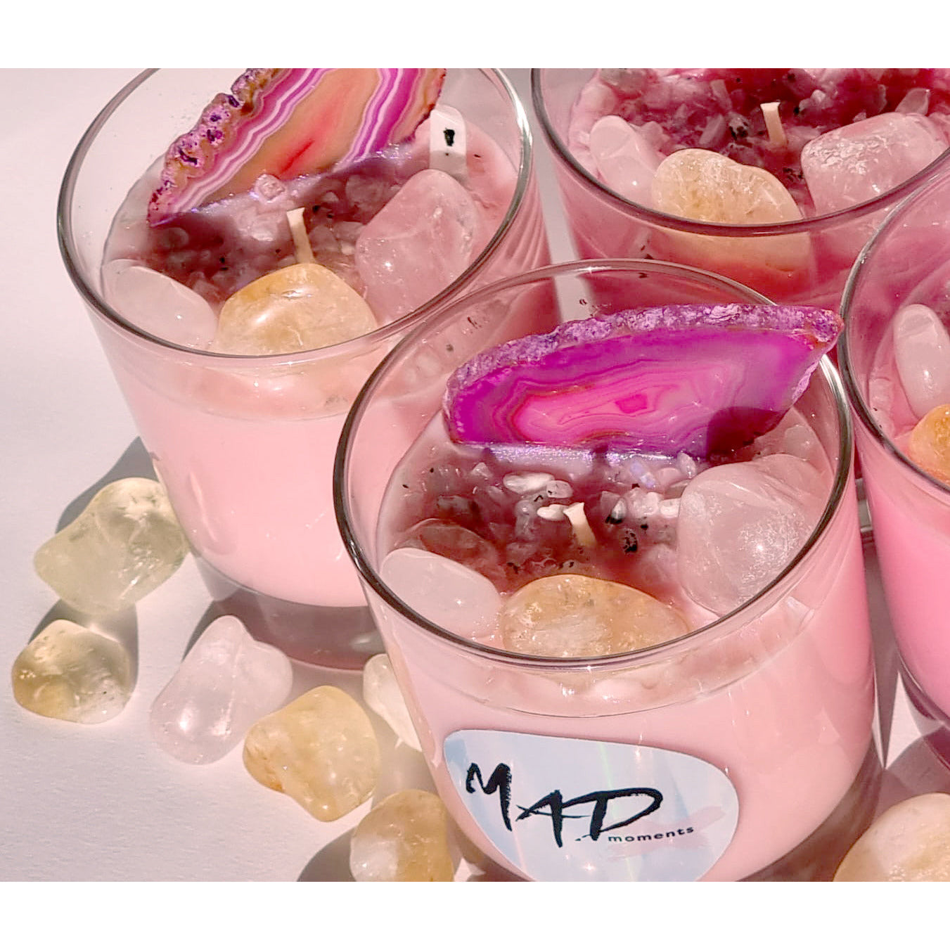 This candle contains: Rose quartz, the "love stone", which is believed to open the heart and promote feelings of love and compassion towards oneself. Citrine, a stone of positivity and abundance, promotes self-confidence and healing. Pink agate, a stone of gentle strength, helps to calm the mind and ease worries, while rainbow moonstone, a stone of balance and peace, soothes and balances emotions.