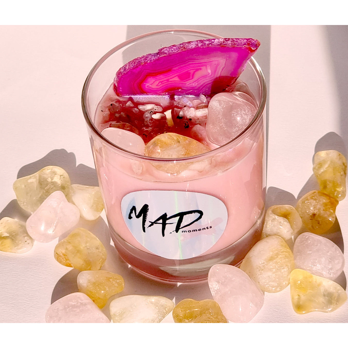 The Uplifting, Rose Quartz, Citrine, Pink Agate, and Rainbow Moonstone Healing Candle is a unique blend of natural crystals and fragrances that promote self-love and emotional healing.